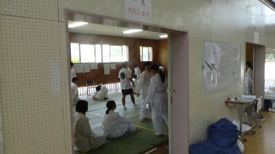 体育館で創作ダンスと柔道をやっていました。柔道は後ろ受け身のテスト、その後、3人組で固め技の試合をやり盛り上がっていました。