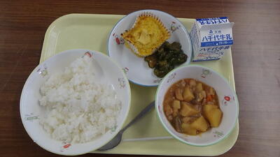 ごはん、ひき肉と切り干し大根の卵焼き、ごまきゅうり、若鶏のみそ煮、牛乳です。おいしかったです。
