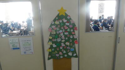 各学級の前の扉の横にクリスマスツリーが貼りだされました。各自のクリスマスプレゼントとしてほしいことがツリーの中に貼られています。