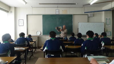 学校司書さんに読み聞かせをしてもらいました。今日の本は「カミさま 全員集合」という八百万の神様が10月の神無月に出雲に集まる物語でした。生徒たちは楽しそうに聞いていました。
