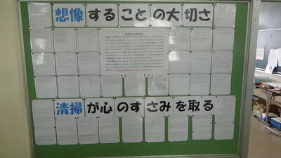 清掃に関する掲示物があります。1学年の先生方は清掃を通して生徒たちに成長してほしいということで、学年集会等事あるごとに生徒に伝えています。生徒の考えも貼りだされています。