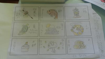 学習目標「2つの縁起物を組み合わせてオリジナルの縁起物を作ろう」ということで縁起物の絵を書いていました。絵のセンスがいいです。最終的に粘土で作品を作ります。