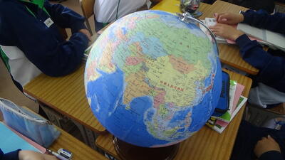 地球儀と世界地図の長所と短所を確認しながら、日本の位置について学んでいました。