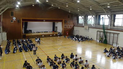 4時間目に体育館で久しぶりに生徒集会が行われました。生徒主体の自治活動として生徒会長からの話、各専門委員長からの話がありました。どの生徒も立派に全校生徒の前で、発表していました。生徒主体が定着してきました。発表内容を簡単に紹介します。