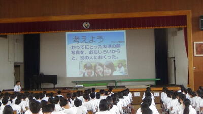 5時間目に体育館で1年生SNS講演会を市川市の少年センターの先生を講師に招いて行いました。事前アンケートをもとに生徒の実態に合わせた内容でした。実際に起きた旭川の事件を例に挙げ、生徒同士の話し合いを織り交ぜながら肖像権、著作権等について学習しました。特に大切だと思ったのは「ネット上で知り合った人には会ってはいけない」ということです。そして会の最後に講師の先生から「大人とは必要な場面で助けてと言えること」ということを生徒たちに伝えられて終わりとなりました。