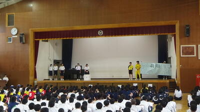 昨日5時間目に体育館で部活動壮行会が行われました。各部から最後の大会やコンクールに向けての決意表明、1・2年生からの横断幕やさいころの寄せ書き贈呈、その後は3年生の部活動の生徒による円陣を行い、終了となりました。なお1年生については教室で体育館の様子を中継して、教室での参加となりました。 この夏に部活動の生徒も外部で活動している生徒も悔いのないよう最後の大会やコンクールに臨んでください。応援しています。