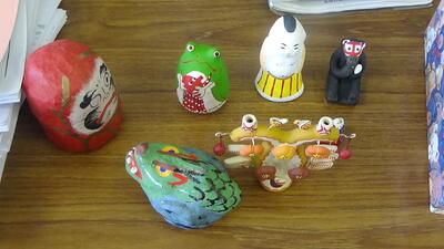 学習目標「2つの縁起物を組み合わせてオリジナルの縁起物を作ろう」ということで縁起物の絵を書いていました。絵のセンスがいいです。最終的に粘土で作品を作ります。