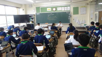 ALTによるスピーキングテストが別室で行われていました。テスト以外の生徒は、教室で課題「自分の好きな曲を選んで、英文で紹介しよう」ということでタブレットでインターネットを活用して課題の取り組んでいました。ある男子生徒は心に歌詞が刺さったので選曲したと教えてくれました。