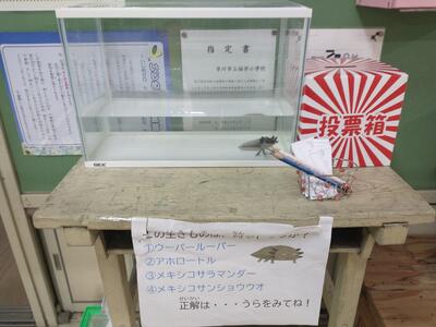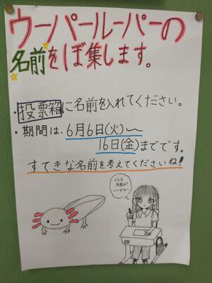 今年度から、校長室前でウーパールーパーを飼い始めました。ウーパールーパーを見に来る子が増え、飼育栽培委員会が名前を募集することになりました。どんな名前になるか楽しみです。