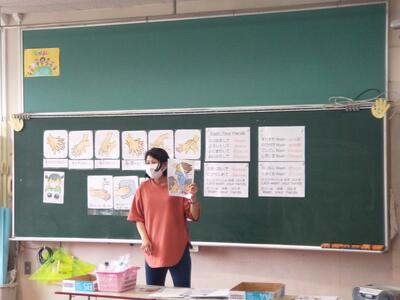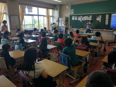 授業で夏休みの思い出を発表していました。