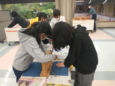 図工の授業の様子です。自分のイメージしたものを手や道具を使って造形していきます。