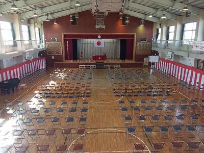 本日5校時に、5年生と職員で、卒業式の準備をしました。椅子並べや紅白幕張りで、5年生が活躍しました。
