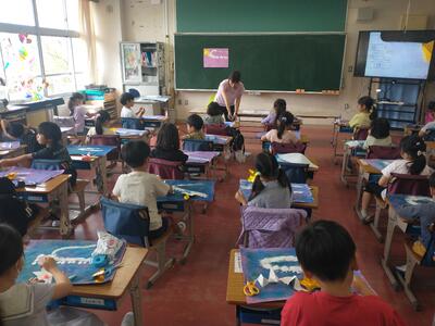 今日、1年生は「しゃぼん玉名人」をお招きし、大きなしゃぼん玉づくりを教わって、しゃぼん玉遊びをしました。曇り空で風も無く、とっても上手にしゃぼん玉を作って、遊んでいました。