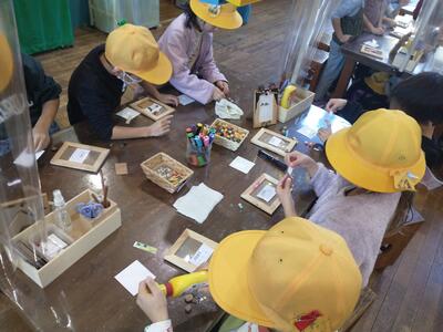 ほぼ予定どおり9∶30にアンデルセン公園に到着しました。木のアトリエで、写真立てづくりをしています。