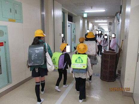 今日、「煙中時の避難や地震時の行動について、体験を通して学ぶことで、実際に災害が起きた時の適切な避難の仕方を身に付ける」ことをねらいとして、避難訓練を実施しました。