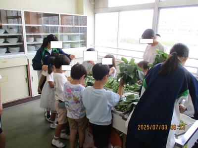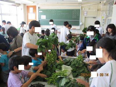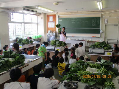 7月3日 1年生は小学校の給食を作っている中学校に行き、枝豆もぎを体験しました。