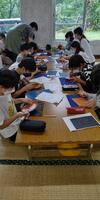 日光彫り体験をしました。あらかじめ考えてあった図案を写し、引っ掻き刀と呼ばれる独特の彫刻刀を使って真剣に彫っていました。