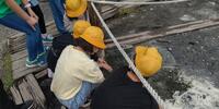 ゴールに近づいた光徳沼(今は、川のようですが)で、10℃の冷たい水に手をいれています。