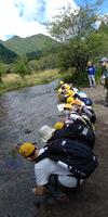 ゴールに近づいた光徳沼(今は、川のようですが)で、10℃の冷たい水に手をいれています。