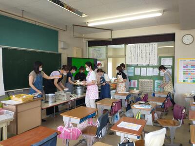 1年生保護者の希望者を対象に給食試食会を開催しました。コロナ禍で開催が見送られていたので、久しぶりの試食会となりました。福栄中学校から、栄養教諭の先生が来校し、給食について説明していただきました。その後、参加者に配膳も体験していただきました。