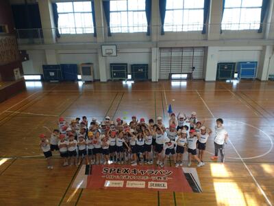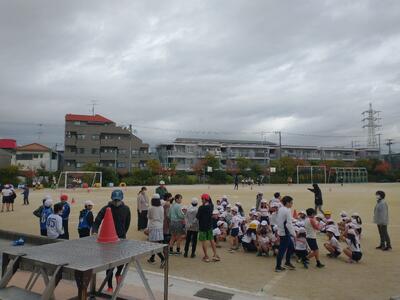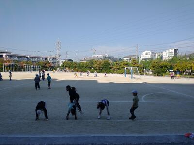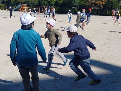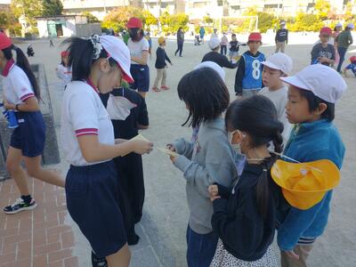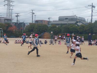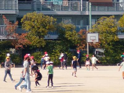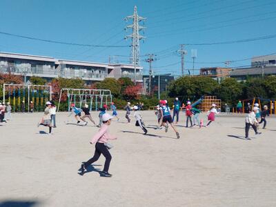今日の業間休みに、体育委員会が企画した1.2年生鬼ごっこがありました。たくさんの児童が参加し、走り回っていました。