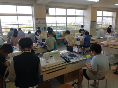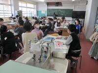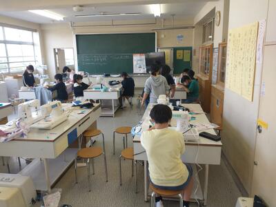 5年生が、ミシンでエプロンを作っています。ミシンの使い方に慣れていないので、苦戦する子もいますが、頑張って縫っていました。
