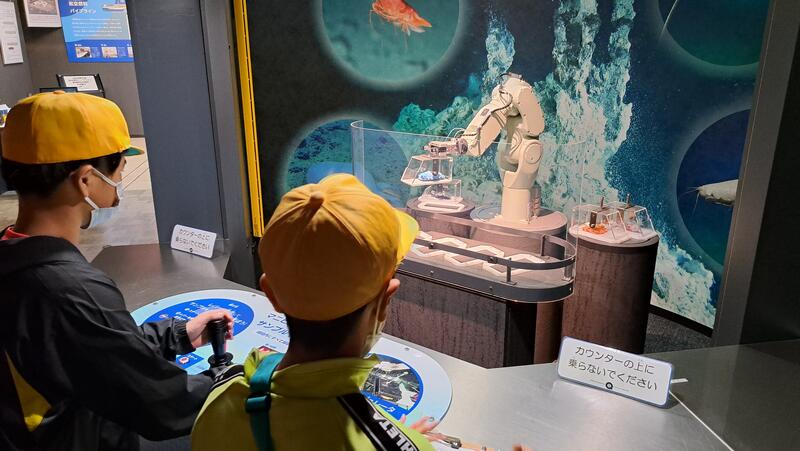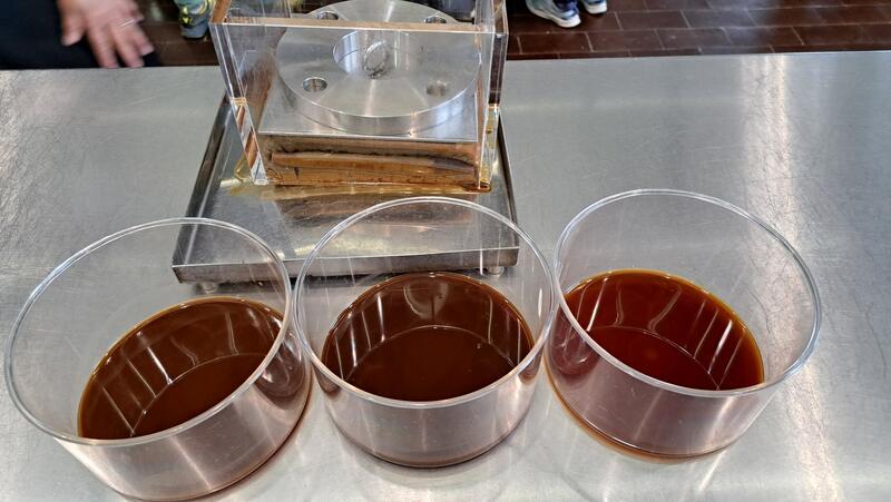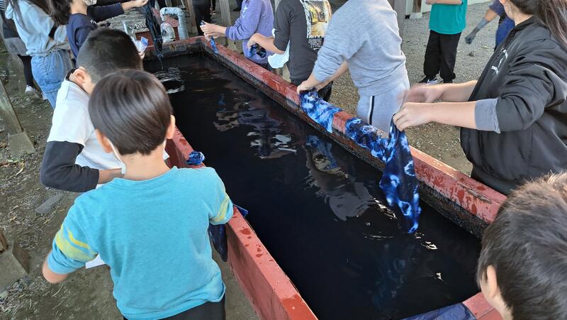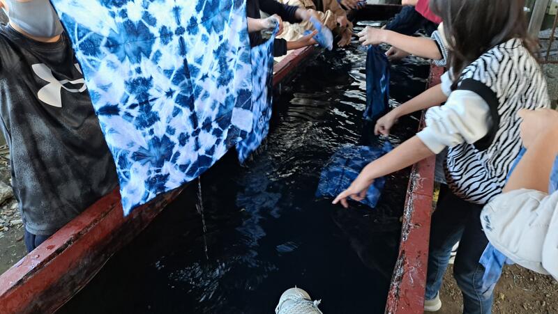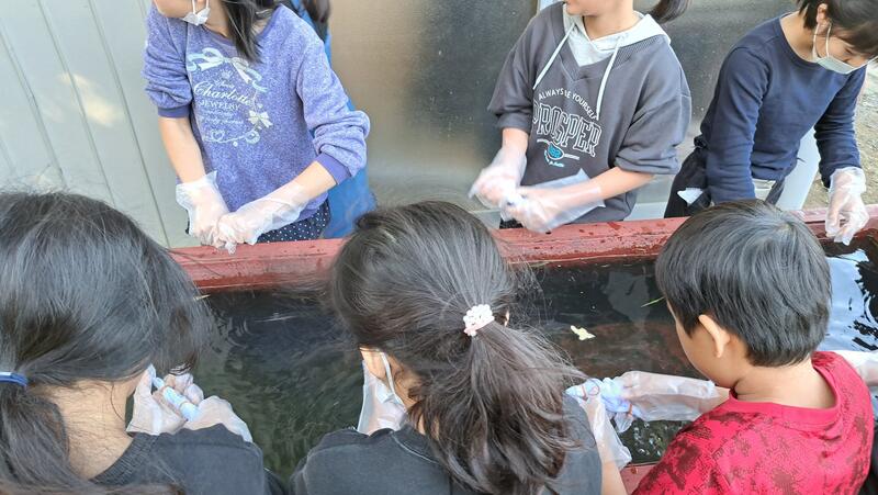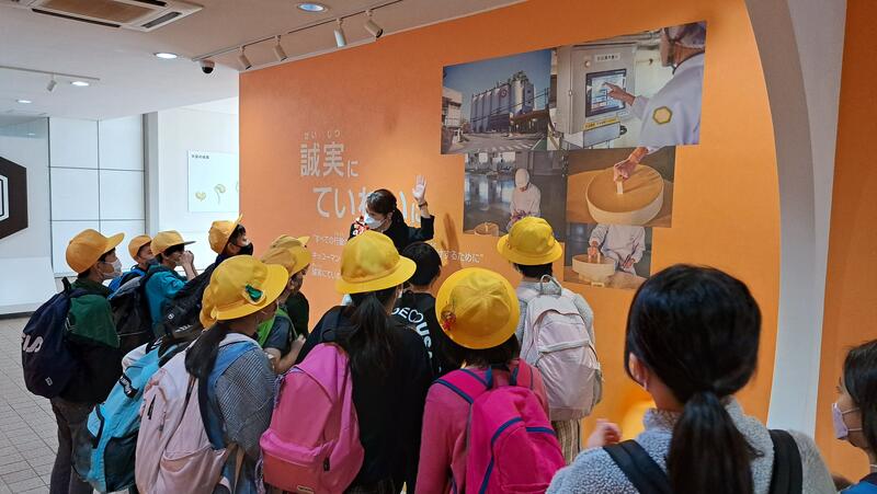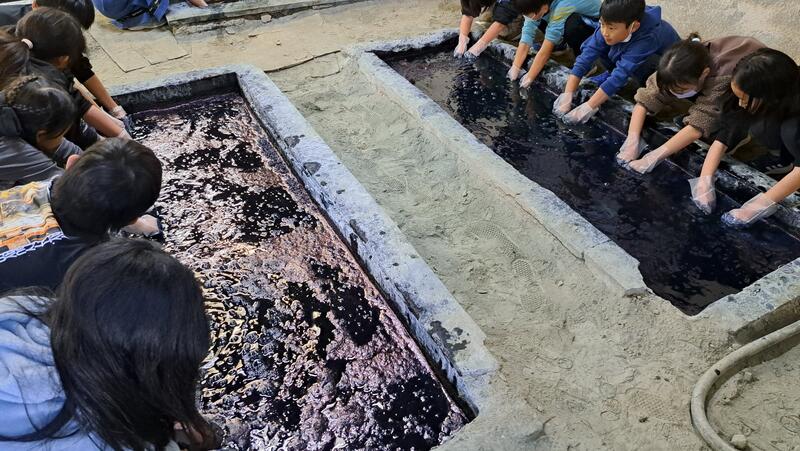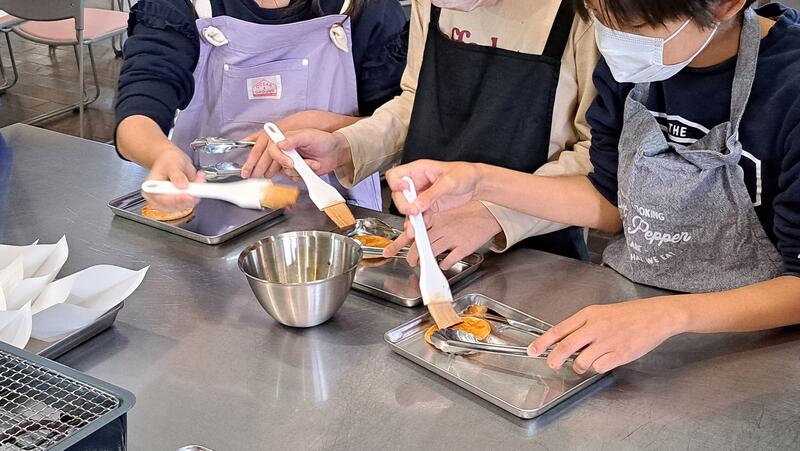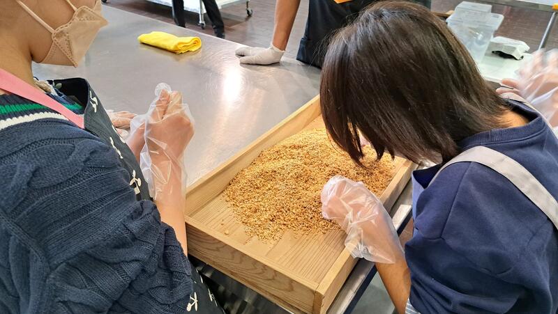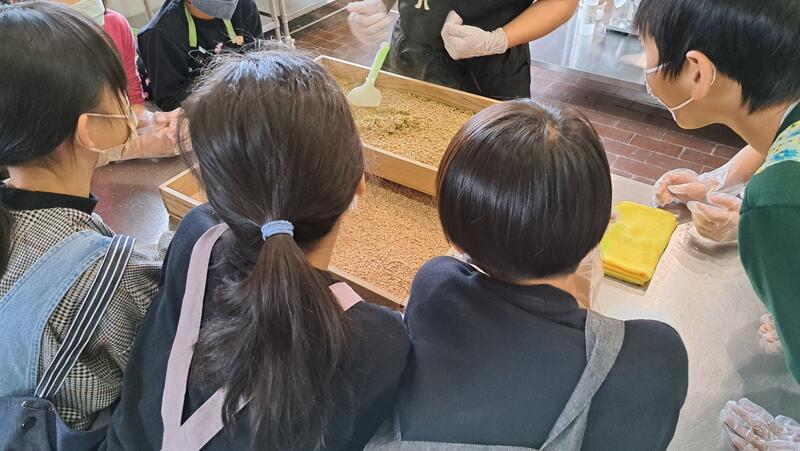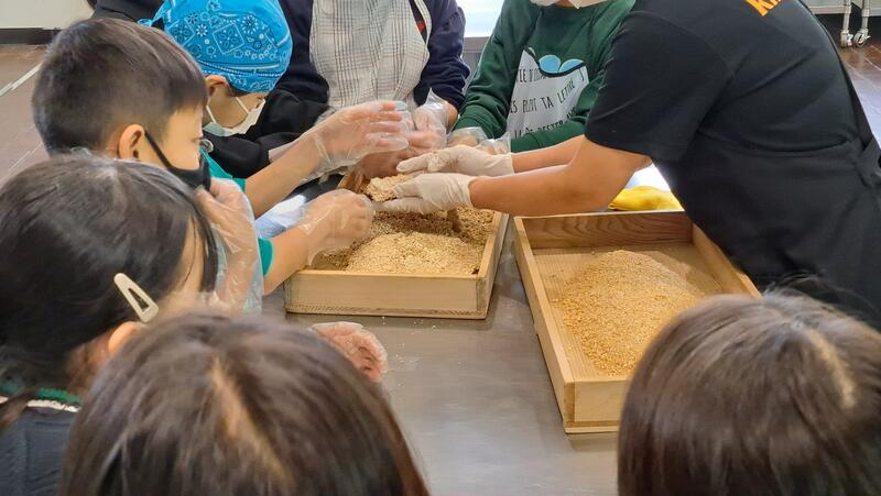 感触を楽しみながら、しょうゆ作り体験をしています。