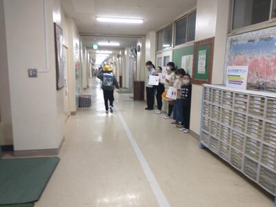 今日のあいさつ運動は、フランス語でした。交流仲間委員会の子たちが、「ボンジュール」と全校児童に声をかけていました。