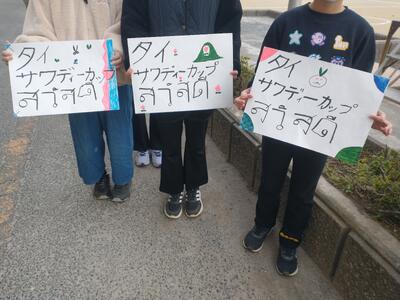 今週から、交流仲間委員会があいさつ運動をしています。昇降口の前で、いろいろな国の言葉で「おはよう」と進んであいさつをしています。はじめは、タイ語です。