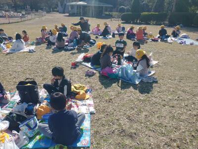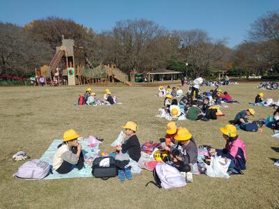 お昼のお弁当の時間です。気持ちのいい青空の下、おいしそうに食べていました。