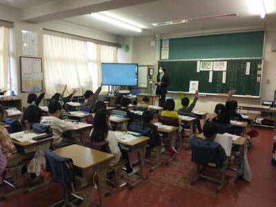 南行徳中のALTの先生が来校して、低学年のクラスで、外国語(英語)の授業を行いました。アニメのキャラクターのクイズをしながら、アルファベットの発音を教わりました。
