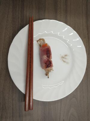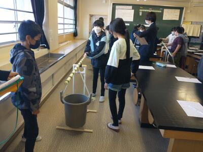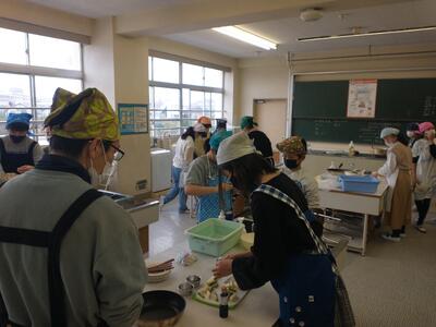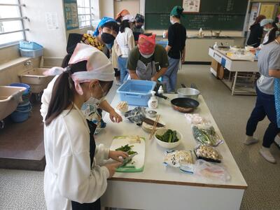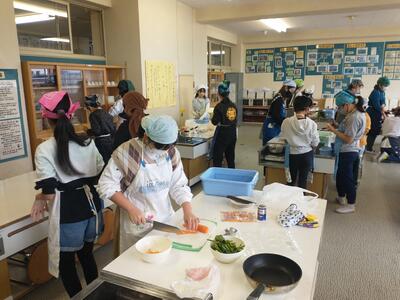 6年生が、野菜のベーコン巻きの調理実習を行っていました。中身の野菜は、グループごとに違い、工夫して調理していました。
