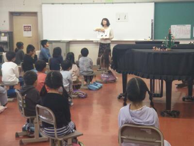 音楽部とクリスマスソングを一緒に歌うイベントがあり、1週間ほど練習に参加した児童が発表をしました。