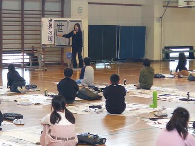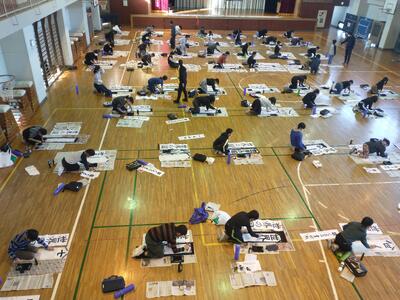 昨日、今日の2日間、3〜6年生が書き初め練習をしました。書道教室の先生を講師に招き、字形や筆使いを教わりました。