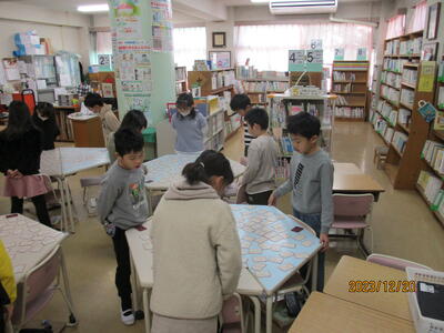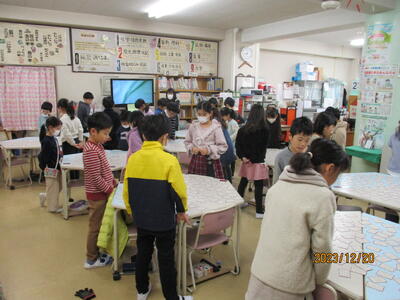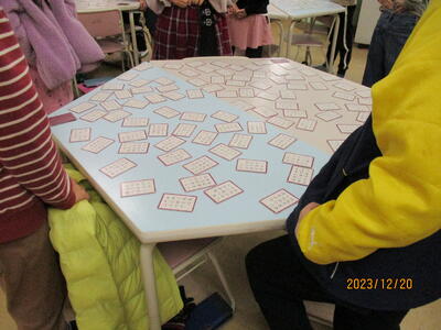 百人一首かるたの練習風景です。暗唱すると、上の句だけ読んで、下の句の札を取ることができます。冬休みに百人一首暗唱に取り組んでほしいです。