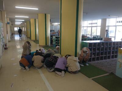 今日の業間休みに、予告なし避難訓練を実施しました。地震は、いつどこで起きるかわかりません。日頃から訓練を重ね、自分の命を守る行動を身につけてほしいです。