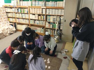 あちらこちらの教室から、百人一首を読む声が聞こえてきます。休み時間には、図書委員会の児童が読み、かるたの練習会をしていることもありました。