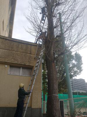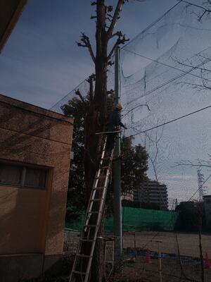 2年に一度、校庭の樹木剪定があります。植木屋さんが高木の剪定をしています。