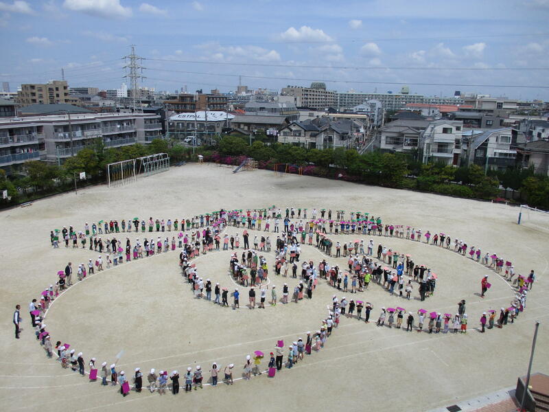 今日は、全校で40周年記念の航空写真撮影を行いました。朝は霧がかかった曇り空で心配しましたが、撮影時刻11時40分過ぎには、青空も見え、無事に撮影することができました。デザインは、昨年度末に児童に募集したもので、現在6年生の児童が考えたものが採用されました。