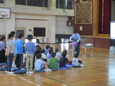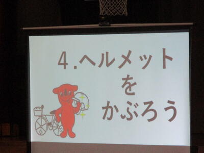 今日は、市役所の交通計画課の方を招いて、交通安全教室を行いました。動画と実技を交え、わかりやすく教えていただきました。