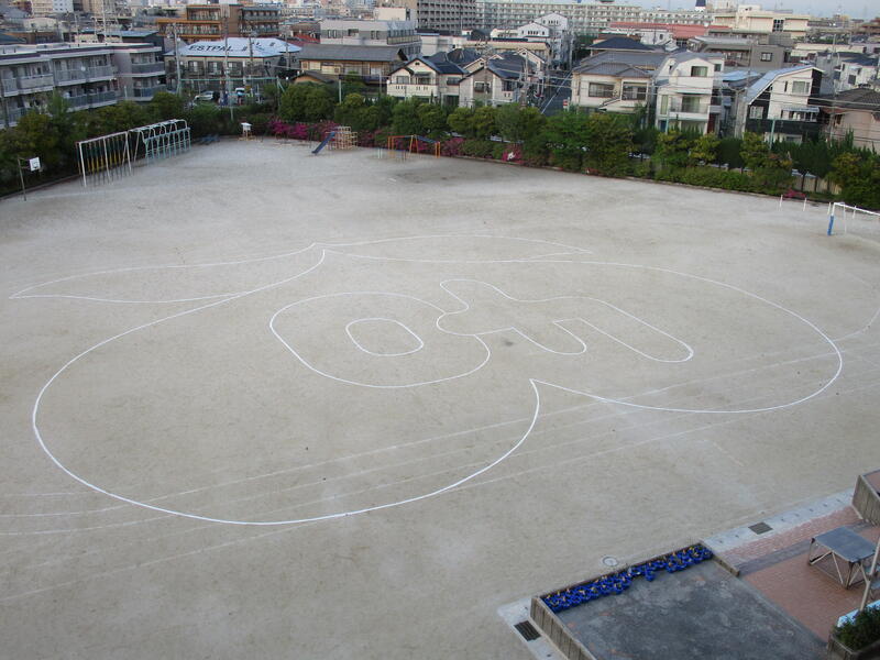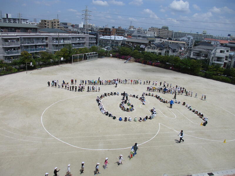 今日は、全校で40周年記念の航空写真撮影を行いました。朝は霧がかかった曇り空で心配しましたが、撮影時刻11時40分過ぎには、青空も見え、無事に撮影することができました。デザインは、昨年度末に児童に募集したもので、現在6年生の児童が考えたものが採用されました。