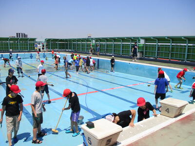 来週からの水泳指導に向けて、プール清掃を行いました。PTAの福栄サポーター(ボランティア)の方、お父さんの会の方、6年生児童が協力してプールを掃除しました。40年使用しているので、ぴかぴかとまではいきませんが、きれいになって、これで無事にプール開きが行えそうです。ご協力いただいた皆様、ありがとうございました。
