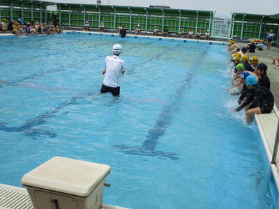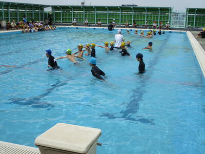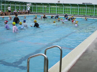 6月18日から、水泳指導を開始しました。今日は、今年度初めてのプールなので、お清めの塩をまいたり、約束事を確認したりして、その後水慣れをしました。見守りボランティアの皆様、ご協力ありがとうございます。
