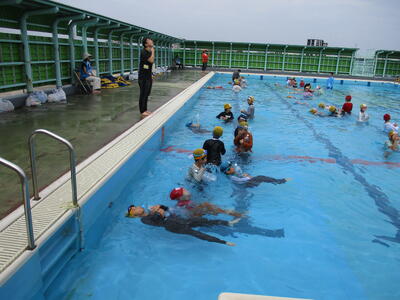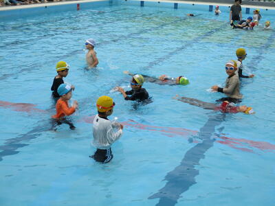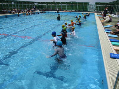 今日は中学年、高学年が着衣泳を行いました。水の事故に備え、服を着たまま水に入ることで、服の重さや動きにくさを体験しました。ペットボトルを使って、浮く練習もしました。