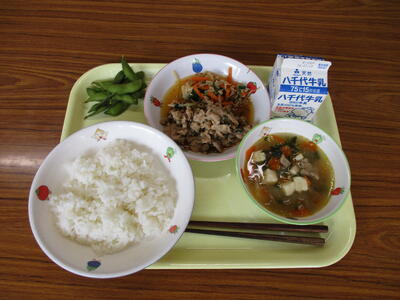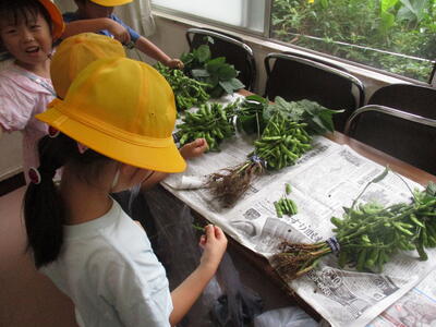 昨日、1年生が福栄中学校に行き、食育の体験授業をしました。栄養教諭の先生から枝豆について教えてもらい、枝豆の実のつき方を眺めながら、自分たちで頑張って枝豆もぎを行いました。枝豆は給食で全校に提供されました。