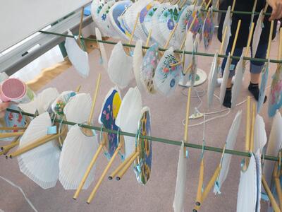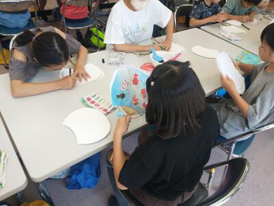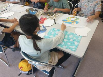 民宿ごんべえに到着し、房州うちわ作りを体験しました。竹のうちわの骨に和紙を糊付けして乾燥させ、型紙に合わせて切り、端に、紙を貼って仕上げます。