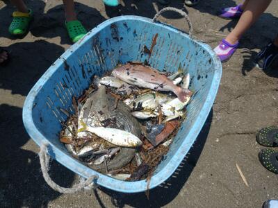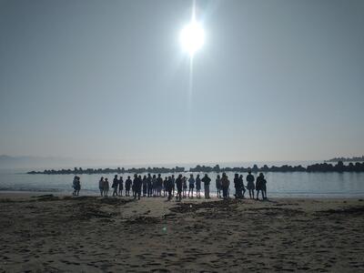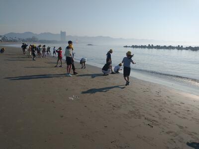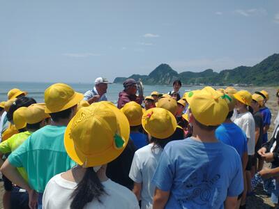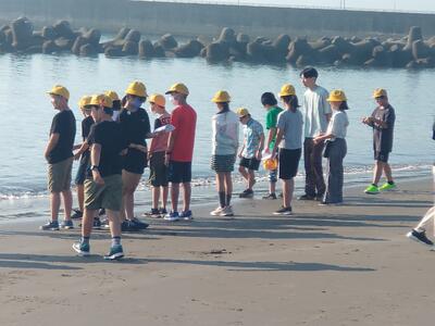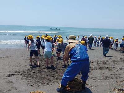 民宿ごんべえで昼食後、岩井海岸で地引き網体験をしました。天気が良く、かなり暑かったですが、クラスの力を合わせて、活動できました。