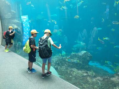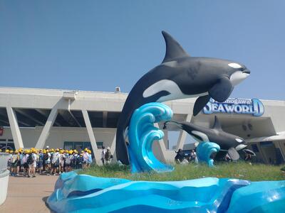 鴨川シーワールドではグループ活動で海の生物を眺めたり、お土産を買ったりしました。その後、鴨川ユニバースホテルに向かい、入館式を行いました。
