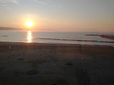 おはようございます。鴨川は朝日がとてもきれいでした。海岸の散歩だけても、汗がにじむような蒸し暑さです。散歩の後は、朝食をとっています。おかずもいろいろあります。