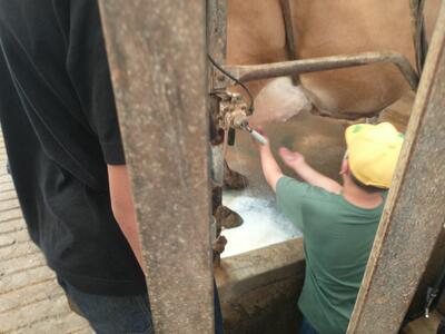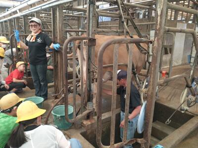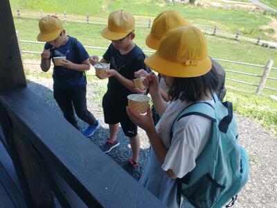 お世話になったホテルの方にお礼を伝え、出発しました。須藤牧場では、乳絞り体験をして乳牛の話を詳しく教えていただき、最後においしいソフトクリームを食べました。